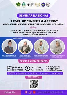 Fakultas Tarbiyah UIN Syekh Wasil Kediri bekerja sama dengan Pusat Unggulan Inovasi (PUI) Educational Resilience Universitas Negeri Yogyakarta akan menyelenggarakan Seminar Nasional bertema “Level Up Mindset & Action: Membangun Resiliensi Akademik di Era Artificial Intelligence”. Kegiatan ini akan dilaksanakan pada*Selasa, 21 Oktober 2025, bertempat di **Aula Lantai 4 Rektorat UIN Syekh Wasil Kediri, mulai pukul 07.30 hingga 15.00 WIB.